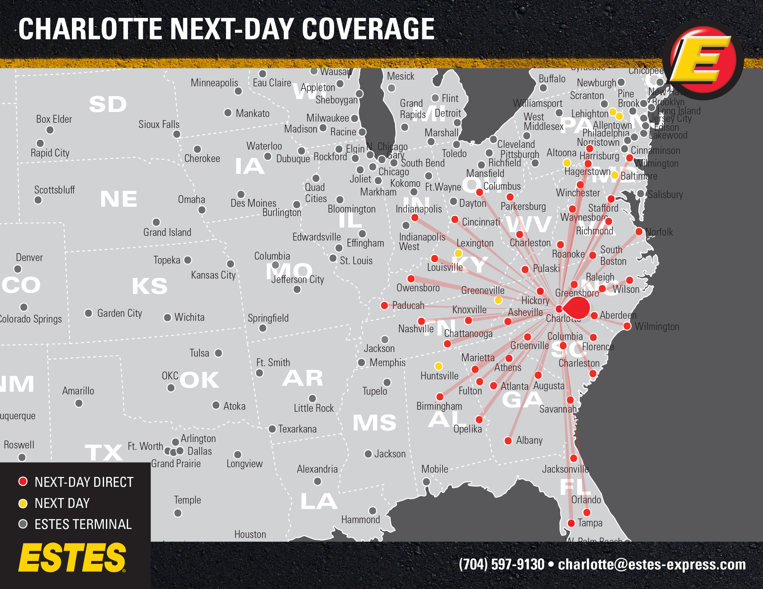 Estes offers next-day direct LTL freight shipping from Charlotte to Atlanta, Indianapolis, Nashville, Cincinnati, Jacksonville, Orlando, Columbus, Louisville, Richmond, Norfolk, Savannah, Knoxville, Chattanooga, and Columbia, as well as next-day LTL to Baltimore, Lexington, Huntsville, and more. Learn about the benefits of shipping through this hub terminal.