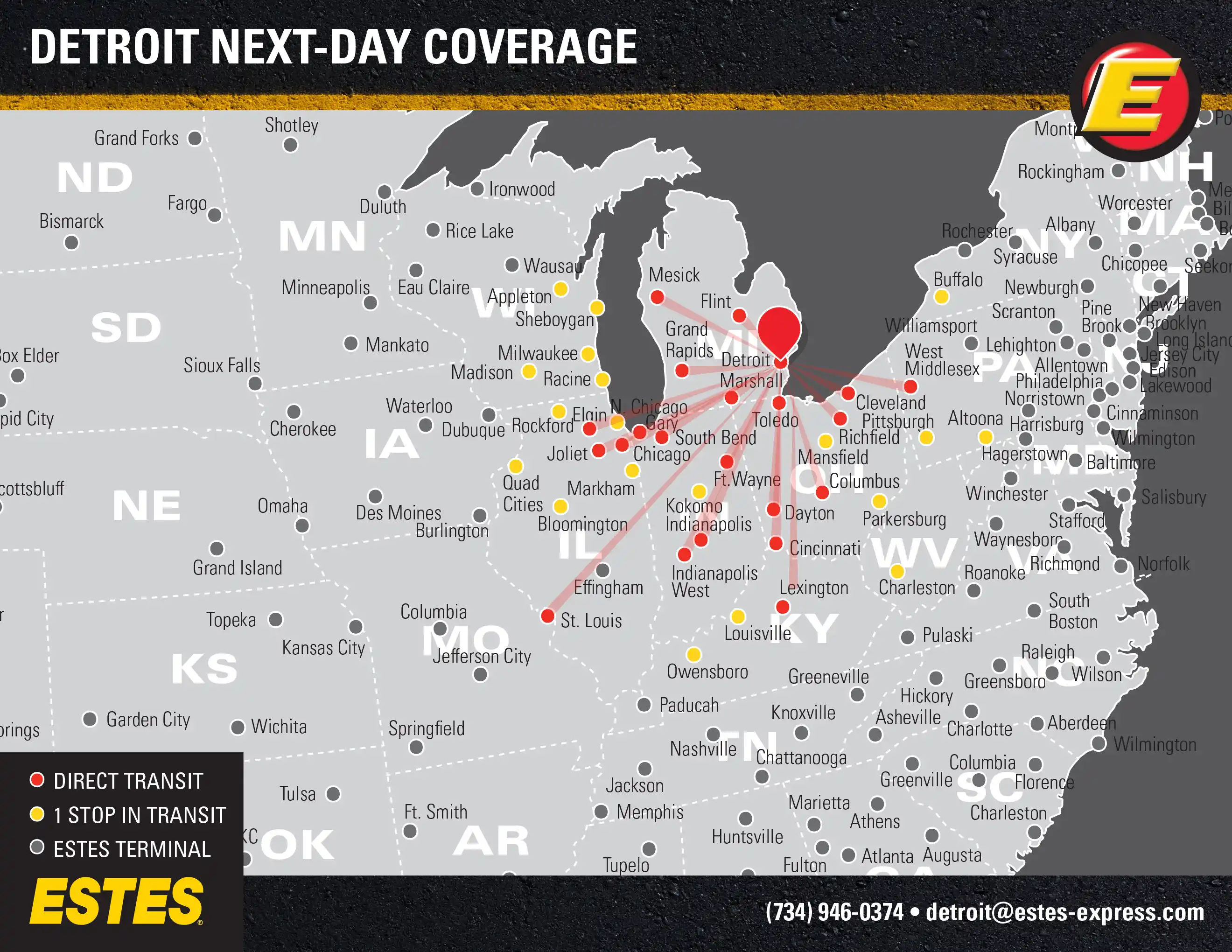 Estes offers next-day direct LTL freight shipping from Detroit to Chicago, Indianapolis, Cincinnati, Cleveland, Columbus, St. Louis, Lexington, Toledo, Dayton, and Grand Rapids, as well as next-day LTL to Toronto, Milwaukee, Pittsburgh, Louisville, Madison, and more. Learn about the benefits of shipping through this hub terminal.